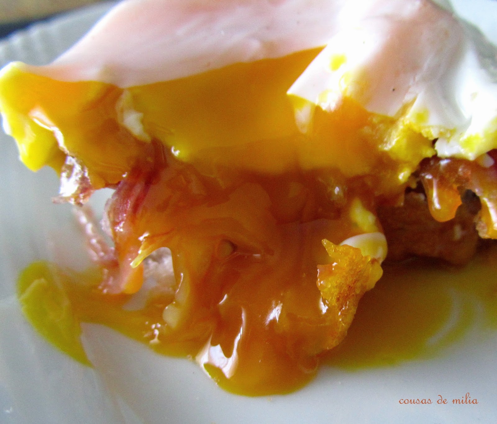 Calentamos el aceite en una sartén y freímos los huevos, los escurrimos sobre papel de cocina, los cortamos con aro de emplatar, para retirar es exceso de clara, lo colocamos sobre la tosta que teníamos preparada... y degustamos un montadito delicioso.