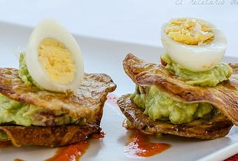 Par la presentación pondremos en la base del plato un poco de mojo rojo, sobre el mojo rojo ponemos una cucharita de guacamole, una chip de batata, repetimos con el guacamole y otra chip de batata, terminamos con una cuchara de guacamole y la mitad de huevo de codorniz.