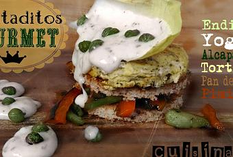 Hora de empatar, amigos. Colocamos, por este orden, una rebanada de pan de molde, el pimiento rojo, otra rebanada de pan y la tortilla (a la que habremos dado una singular forma circular con el aro de cocina). Coronaremos nuestros originales montados Gourmet con una hoja de endivia sobre la que derramaremos la deliciosa salsa de yogur. Decoraremos nuestros montaditos con alcaparras que colocaremos sobre la salsa de yogur.