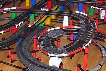 En este montaje combino tres circuitos de ferrocarril y uno de slot. En el suelo esta el circuito más largo de ferrocarril formado con 72 vías curvas y 48 vías rectas que da una cuerda total de 40,26 m que tardan en recorrer 1min 20 seg cada composición de trenes de manera que eligiendo locomotoras de igual potencia se pueden dandoles 20 seg de desfase hacer circular a 5 trenes sin peligro de alcances inmediatos..
