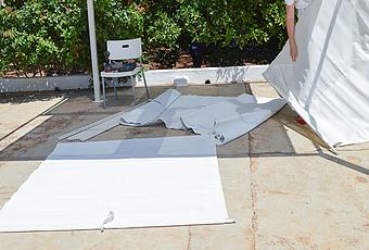 Como el espacio que queríamos cubrir era bastante amplio, decidimos colocar juntas dos pérgolas, con lo que la zona de sombra se multiplica considerablemente para todos los que somos. Haceos una idea de que en un día de reunión familiar podemos ser 20 como mínimo. Así que, en nuestro caso, más siempre es mejor. Al desembalar las cajas nos encantó ver la buena calidad del material de cubierta. La trama del tejido es muy consistente con lo que reflecta bastante bien el calor y el sol. Lo primero fue extender bien cada toldo (4 para cada pérgola), y distribuir las varillas que se colocan en el interior del tejido en los 4 lados y en el centro, para que la resistencia sea buena. Para este primer paso contamos con la inestimable ayuda de Mike y Harvey, nuestros dos perros labradores que pensaban que les estábamos colocando unas camitas o algo por el estilo. Todo su afán era subirse encima =)