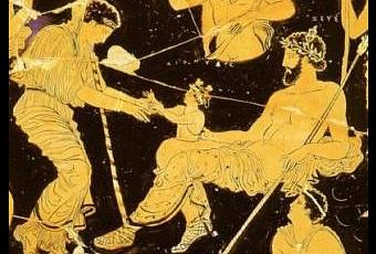 En una entrada anterior, ya comentamos la figura de Sémele, amante de Zeus y madre de nuestro dios preferido, Dionisos, y que murió de una forma trágica, churruscada como una salchicha en una barbacoa , bajo el poder de Zeus y el engaño de su mujer Hera ; no obstante, Dionisos logró salvarse y fue cosido por Hermes a la pierna del Cronida, hasta que por fin nació rasgando su muslo ; ya adulto, Dionisos adquirió su carácter divino, gracias a sus dotes para transformar las uvas en vino , y decidió recuperar a su madre ; para ello pidió ayuda a Prosimno, para que le guiase en su viaje al fondo del Lago Alcianio, entrada al Hades , a cambio de sus favores sexuales a la vuelta, aunque no llegó a producirse ese encuentro carnal, ya que Prosimno murió antes de cobrar su deuda ; Dionisos llegó al Hades y negoció con Perséfone, logrando su objetivo, recuperar a Sémele de entre los muertos; en adelante se llamaría Tione, y viviría en el Monte Olimpo, bajo la protección de Zeus y su hijo , ocultando su pasado pecaminoso a la celosa y vengativa Hera ; de alguna forma, loca e irracional como son los dioses y las musas , el vino ayudó a que una historia de amor y pasión, tuviese tan buen final.