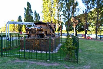 El monumento Al Taxista.La escultura, realizada por el artista Fernando Pugliese, esta realizada con un polímero que simula bronce, es muy resistente a la intemperie y luce muy bien.