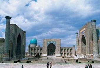 PLAZA DEL REGISTAN. Este complejo de majestuosas madrasas es el centro neurálgico de la ciudad y uno de los lugares más visitados del Asia Central. Fue el centro medieval del comercio en Samarkanda y la plaza se encontraba probablemente unida con el bazar. En la era de la restau-ración soviética se excavaron tres metros en la tierra para dejar a los edificios con su altura original, actualmente el Gobierno Uzbeco está acabando lo que los soviéticos empezaron. Este conjunto arquitectónico es uno de los máximos testimonios de arte, enteramente revestido de mayólicas esmaltadas.