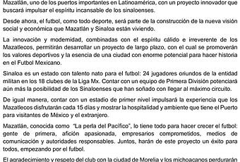 Morelia mediante un comunicado en su cuenta de twitter anunció su cambio de sede de Morelia a Mazatlán, aprovechando la terminación del torneo y pausa futbolera el equipo inicia su traslado a Mazatlán, se les desea éxito en su nuevo proyecto y a la vez una tristeza profunda por la afición que queda atrás sin equipo luego de tanto años de amor y alegrías hacia el club.