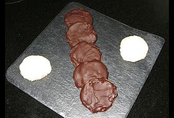 Ingredientes:- 50 gramos de manteca de cerdo.- 110 gramos de harina.- 30 mililitros de vino blanco.- 2 cucharaditas de azúcar.- Chocolate negro para fundir.- Chocolate blanco para fundir.- 2 cucharaditas de mantequilla.Elaboración:Echamos la manteca de cerdo a temperatura ambiente, la harina, el azúcar y el vino en un bol lo mezclamos todo. Luego echamos en la encimera un poco de harina y seguimos trabajando la masa hasta que tenemos una masa uniforme, las estiramos con un rodillo y con un vaso vamos cortando círculos.Colocamos los círculos encima de un papel de horno y lo metemos al horno durante 10 minutos con calor arriba y abajo a 180º. Sacamos y los bañamos con chocolate negro o blanco que habremos derretido con un poco de mantequilla al microondas. Los metemos a la nevera para que se endurezca el chocolate y cuando queramos degustarlos los sacamos.