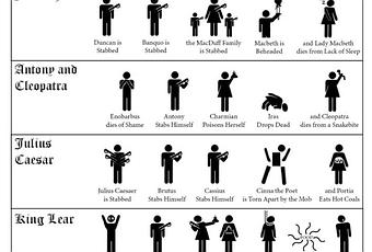 “Antes de Shakespeare , el personaje literario cambia poco; se representa a las mujeres y a los hombres envejeciendo y muriendo, pero no cambiando porque su relación consigo mismos, más que con los dioses o con Dios, haya cambiado. En Shakespeare – escribe Harold Bloom -, los personajes se desarrollan más que se despliegan, y se desarrollan porque se conciben de nuevo a sí mismos (…) La muerte, forma final del cambio, es la preocupación palmaria de las tragedias e historias de Shakespeare, y la preocupación escondida de sus comedias”. Caitlin S. Griffin ha reunido todas las muertes del genio en esta infografía tan didáctica como divertida.