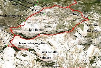 detrás, los picos del grajal de abajo y grajal de arribacresteando los picos del grajal, llegaremos a las rampas finales de la pica del jierru, cuya cima evitaremos ahora pero ascenderemos de vuelta de la morra de lechugales. una vez en las rampas finales de pica del jierru seguimos el sendero por la roca descompuesta que va bordeando el hoyo del evangelista para ir acercandonos al paso que se divide en dos caminos, uno nos lleva a la dcha. a la morra y el de la izq. que es el que cogeremos ahora, nos acercará en un aereo cresteo hasta la cima del pico silla caballo cimero.