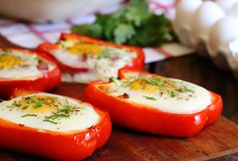Rellenar con queso (rallado previamente o cortado en trozos chicos), colocar el jamón, coronar con un huevo en cada morrón y pimentar a gusto.