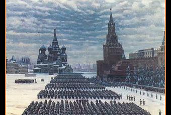 Dos imágenes (la primera una ilustración y la segunda una fotografía) del dramático desfile en la Plaza Roja, con la Wehrmacht a las puertas de Moscú. Stalin ha estado a punto de cancelar el desfile, temiéndose un ataque aéreo de la Luftwaffe sobre las tropas en formación.