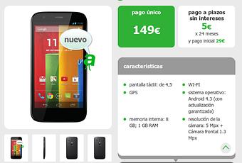 La oferta de Amena es clara, Motorola Moto G de 8GB a un precio de 149€, a pagar en un único plazo, o si queremos fraccionarlo puede hacerse a 24 meses abonando 5€/mes sin intereses, aunque el pago inicial debe ser de 29€, en total 149€. El único requisito, ser cliente de Amena, claro, pero por suerte, en esta OMV no hay ningún compromiso de permanencia, por lo que si nos interesan sus tarifas nos podemos quedar o una vez tenemos el Moto G, cambiar a la operadora deseada.