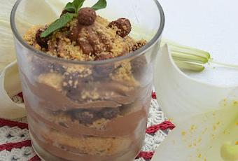 Llenamos cuatro vasos o copas individuales con capas alternadas de mousse, galletas y arroz inflado. Terminando con una capa de galletas.