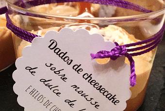 Para hacer los daditos de cheesecake debemos mezclar bien todos los ingredientes con la batidora y meter en el horno durante 60 -70 minutos previamente precalentado a 180º. Pasa saber si está lista pinchamos un cuchillo en la tarta y cuando salga limpio ya estará lista. Dejamos enfriar, desmoldamos y cortamos en daditos.Para el montaje ponemos una base de mousse, unos 3 o 4 daditos de cheesecake, un poco de dulce de leche y para terminar derretimos una tableta de chocolate blanco para hacer unos hilos de decoración.Para la decoración de los vasitos he utilizado cordón morado y tarjetitas recortadas con un troquel de círculo festoneado. Os dejo dos modelos de plantilla, una con las tarjetitas festoneadas y otra con las tarjetitas circulares por si no queréis utilizar troquel para recortarlas. Los agujeritos para pasar la tarjeta por el cordón, los he hecho con una perforadora de papel de las de toda la vida. Los vasitos de plástico transparentes los podéis encontrar en muchos sitios, yo os recomiendo la tienda Los Utensilios del chef, tiene un montón de modelos diferentes tanto de vasitos, como cucharitas, platitos..., vamos, el sitio perfecto si queremos hacer una cena de tapas y pinchos y quedar como reinas.La bandeja de pizarra sobre la que presenté los vasitos es de la tienda Casa.Aquí tenéis las plantillas:- Plantilla tarjetitas circulares- Plantilla tarjetitas circulares festoneadas