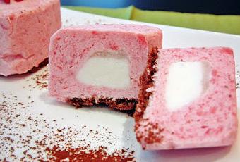 PREPARACIÓN:Para el interior de cava:Lo primero que hacemos es el interior y mejor con tiempo para que endurezca antes de su utilización, por lo que lo podemos hacer el día antes de preparar la mousse.Para ello hidratamos las hojas de gelatina en agua fría y cuando estén bien hidratadas ponemos a entibiar 1/4 parte del cava con el azúcar y fundimos las hojas de gelatina. Vertemos esta mezcla sobre el resto del cava.Semimontamos la nata y vertemos el preparado anterior sobre la nata a intervalos, teniendo la precaución que no esté caliente, mezclando con lengüeta.Vertemos sobre moldes de cubitos, yo he usado unos con forma de corazón. Y lo metemos a congelar.