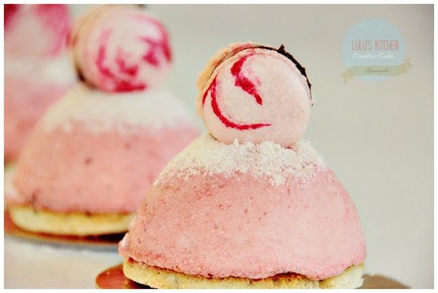 Y así comienza este post. Nada puedo decir, excepto que prefiero que lo comprobéis por vosotros mismo, la delicadeza en su estética. Que lo bonito no les haga creer que es complicado ni lo pequeño tampoco. Es sencillo en su realización y especial a la hora de degustar. Para paladares refinados que podrán encontrar ese sutil sabor y aroma a rosas. Minimousse de fresa sobre una base de dacquoise, que lleva como adorno un minimacarons relleno de chocolate como detalle final. Recomiendo devorarlo al final del postre de un bocado o si es posible, dos bocados para saborear mejor.