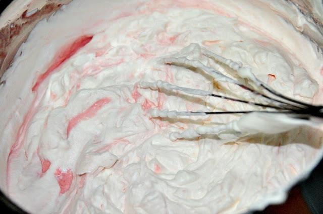 - Batir la nata a punto de nieve y añadirla al puré de fresas con ayuda de una espátula, suave y con movimiento envolvente hasta que la mezcla sea homogénea.