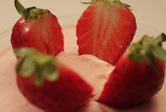 En primer lugar limpiamos las fresas y las batimos, yo he usado una batidora vaso, mientras batimos añadimos 100grs de azúcar. En un bol amplio ponemos la gelatina en polvo y vertemos unos 100 ml del puré de fresas, lo mezclamos, el resto del puré lo ponemos al fuego y lo retiramos cuando entre en ebullición para agregarlo al que está con la gelatina y mezclamos bien, teniendo cuidado de que no nos queden grumos. Dejamos enfriar.