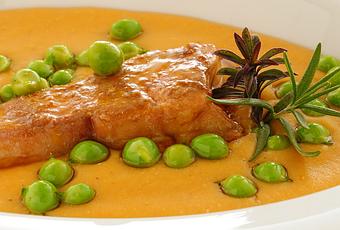 Ponemos una sartén al fuego y la calentamos bien...añadimos el foie y lo marcamos por ambos lados, sacamos el trozo y lo ponemos sobre el puré de lentejas. Sobre la grasa que ha soltado el foie, salteamos brevemente unos guisantes tiernos y los añadimos al puré para darle la nota de color y el toque crujiente, y por último ponemos sobre el foie unas escamas de sal maldón (que a mí se me olvidaron poner antes de hacer la foto, jejeje)