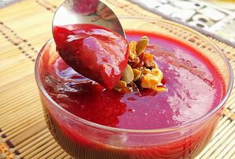 - A la hora de servir caramelizamos los frutos secos colocándolos en una sartén caliente con el azúcar o el sirope de agave hasta que se formen una "piedras" de frutos secos. Las dejamos enfriar y colocamos encima en las copas y servimos.