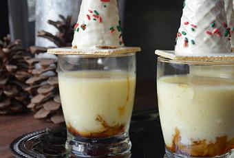 Montamos los vasitos poniendo en el fondo un poco de piña caramelizada, con cuidado añadimos la mousse y dejamos enfriar bien en la nevera. Mejor de un día para otro. En el momento de servir adornamos con la oblea y el cono a modo de sombrero o de árbolito de Navidad.