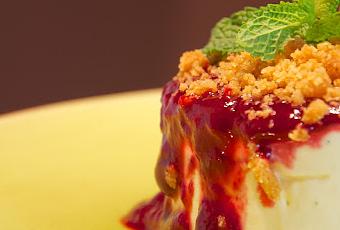 - Decoramos con el coulis y el "crumble" de galletas.