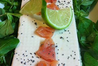 Se desmolda la mousse y se sirve acompañada de los canónigos, con el resto del salmón que habíamos reservado y unas semillas de amapola o bien de granos de pimienta rosa.
