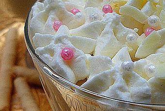 - Montamos los 200 mlts de nata restantes con el azúcar, y con ayuda de una manga pastelera, vamos cubriendo la mousse y adornamos con las perlitas, el chocolate y los barquillos.