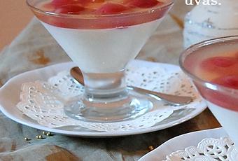 Cuando veamos que ya están bien cuajadas las mousse, hidrataremos las 2 hojas de gelatina restantes en agua fría escurrimos bien y disolver en medio vaso de agua caliente. Mezclaremos esto con el vino moscatel que nos sobró al principio y las uvas.