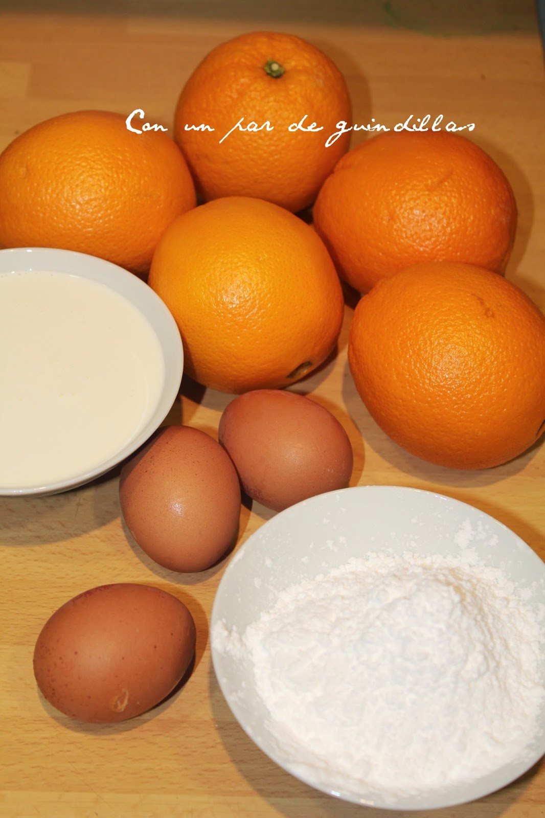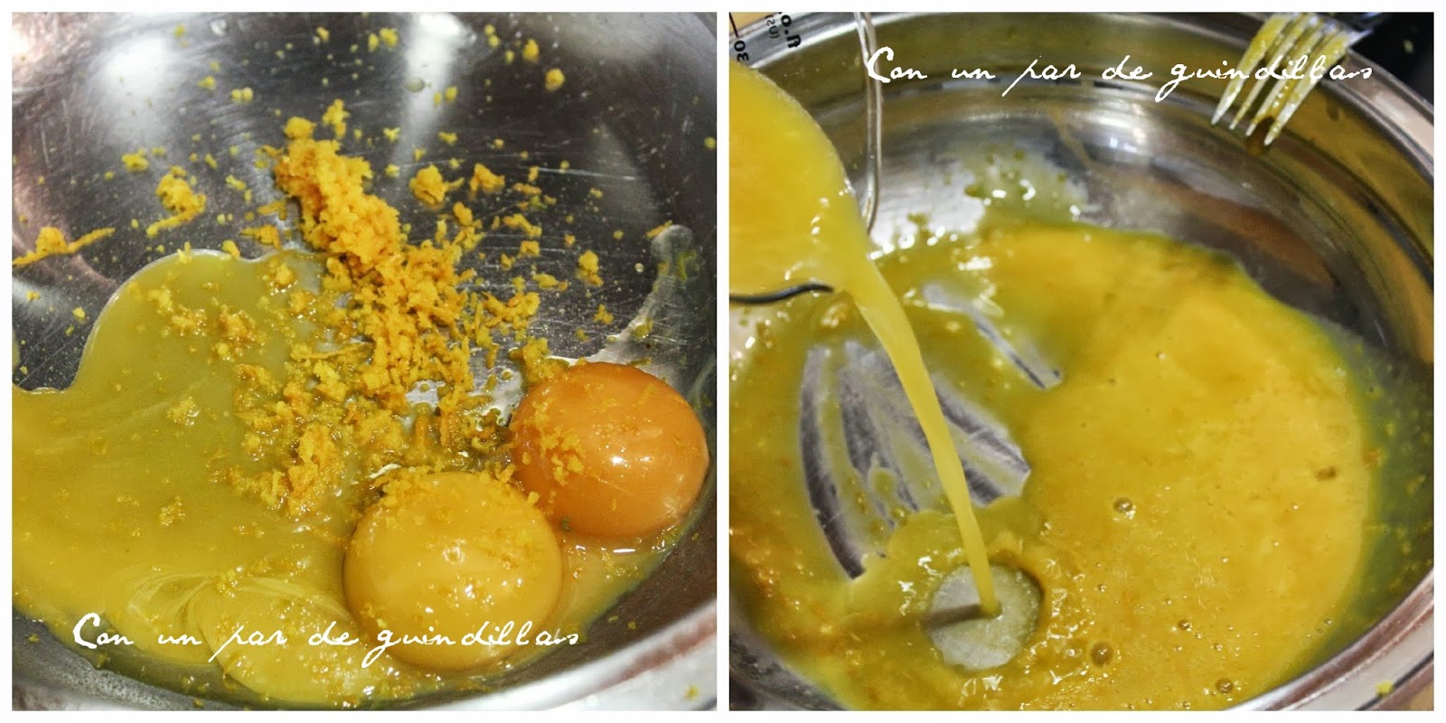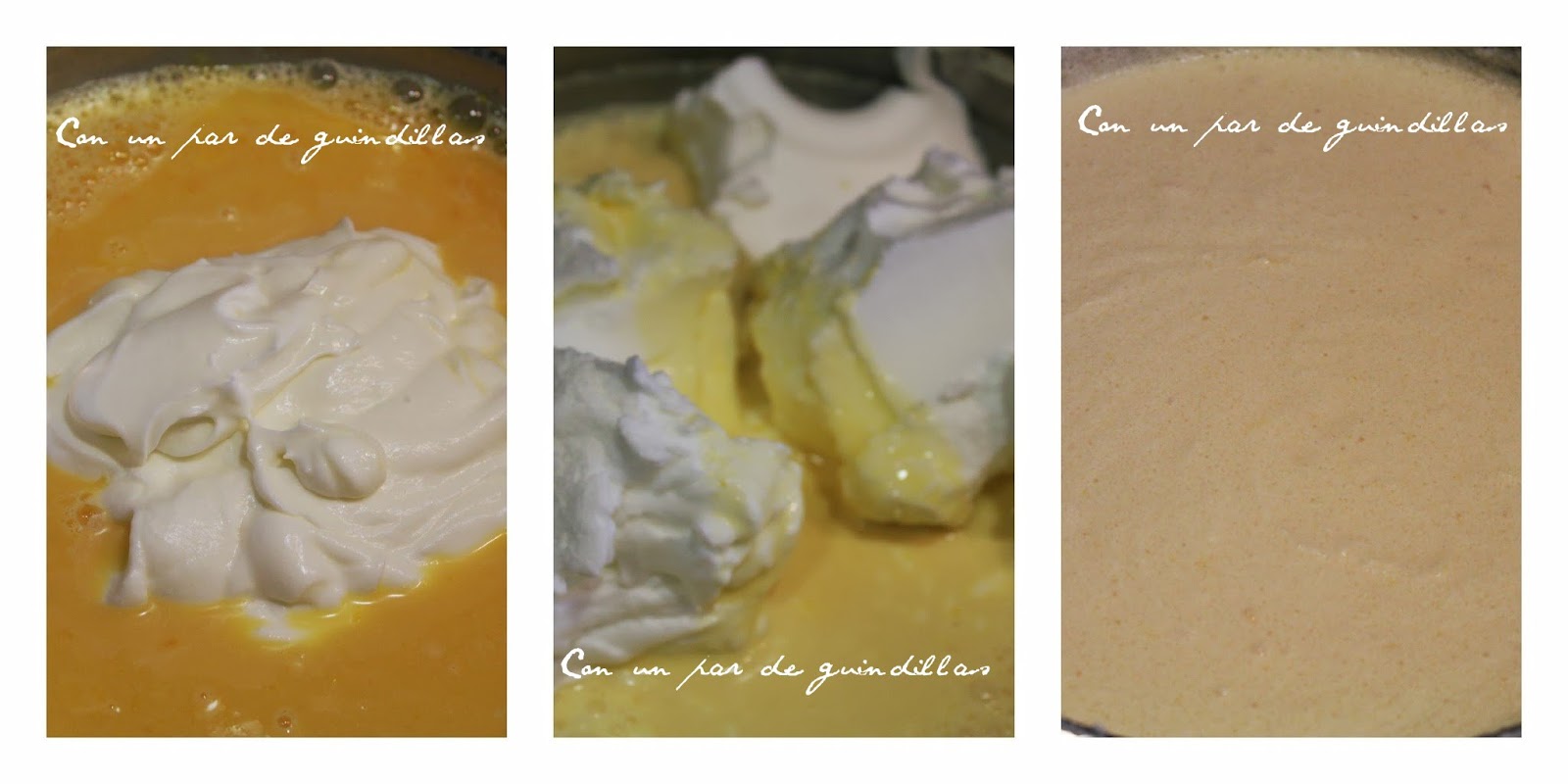1.- Lavo las naranjas y las hago zumo. Las cuelo y las reservo. 2.- Bato las yemas con la ralladura de una cáscara de naranja, hasta que quede una pasta ligera y espumosa. Mezclo ahora con el zumo de naranja poco a poco y sin dejar de mover.