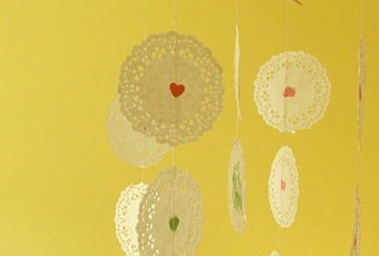 - Luego con papeles de colores decoramos 14 blondas, yo lo he hecho con un simple corazón por ambos lados y estrellas. Podéis hacerlo cómo mas os guste, pero siempre por los dos lados de las blondas.