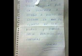 Uno de los laterales del ascensor del edificio que habito vuelve a convertirse en tablón de anuncios donde los vecinos exponen abiertamente sus cuitas. Si hace unas semanas se trataba de un anónimo orinador el que traía a mal traer a nuestro abnegado Presidente, es en esta ocasión una madre la que viendo en peligro la vida de sus hijos y de sus enseres avisa de los malos comportamientos de algún habitante de las plantas altas.El llamamiento angustioso de esta mujer hace que nos solidaricemos con ella y olvidemos de inmediato las carencias de buena sintaxis y puntuación de que muestra su mensaje..