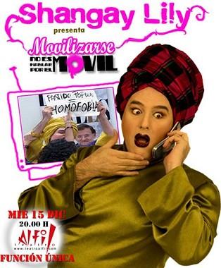 Vuelve Shangay Lily. Reinventada, con un espectáculo único en el que mezcla el ingenio y el humor con el arte y el activismo. Shangay Lily saltó a la fama hace dieciocho años cuando se plantó delante de Mariano Rajoy en una conferencia por sus declaraciones en contra del matrimonio homosexual al grito de "¡Basta ya de homofobia en el PP!". En "Movilizarse no es Hablar por el Móvil" podremos disfrutar de monólogos junto con sus mejores canciones, desde la más sarcásticas como "Gracias Benedicto" considerado un himno ala homofobia de la Iglesia, o su oda a las estrellas de la televisión "Chica Total" Habrá una única función el miércoles quince de diciembre a partir de las 20:00h en el Teatro Alfil Precio de la entrada 15€ Adquiérela aquí Calle Pez 10 metroNoviciado Madrid