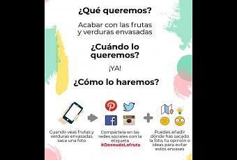 El movimiento #DesnudaLaFruta nos anima a denunciar el problema de las frutas y verduras envasadas en plástico. ¿De verdad es necesario envasar en plástico una cebolla? Ese plástico sólo dura en tus manos unos segundos y en el medio ambiente dura siglos. Proponen que cuando vayamos a hacer la compra le hagamos una foto a la fruta envasada y la subamos a nuestras redes sociales etiquetando a la tienda en cuestión y explicando la razón del movimiento para así concienciar a los supermercados y grandes superficies de que no es necesario utilizar tanto plástico para envolver una fruta.