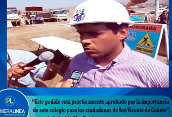 Alcalde Alex Bazán anunció construcción de nuevas veredas y recapeo de la pistaUna buena noticia para la comunidad educativa del colegio Centro de Mujeres. El alcalde provincial de Cañete – Alex Bazán Guzmán, anunció la ejecución de la obra de mejoramiento de pistas y veredas en la zona donde se encuentra esta emblemática institución san vicentina.Desde el programa “Reporte Regional” – la autoridad edil – dijo tener conocimiento del documento enviado por la dirección del mencionado plantel-donde se solicita el apoyo de la comuna provincial.“Este pedido esta prácticamente aprobado por la importancia de este colegio para los ciudadanos de San Vicente de Cañete”, continuó diciendo – tras destacar su renovada y moderna infraestructura educativa.“Nosotros estamos en la obligación de continuar mejorando la calidad educativa y nos corresponde a través de la construcción de nuevas veredas y el recapeo de su pista para que la población escolar pueda transitar en mejores condiciones”, manifestó.