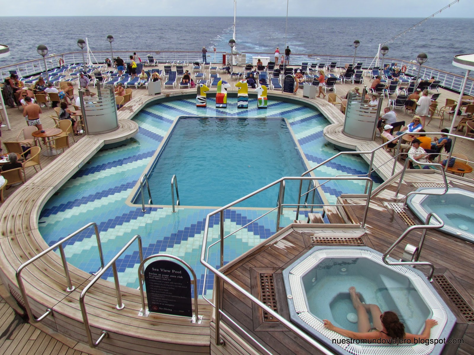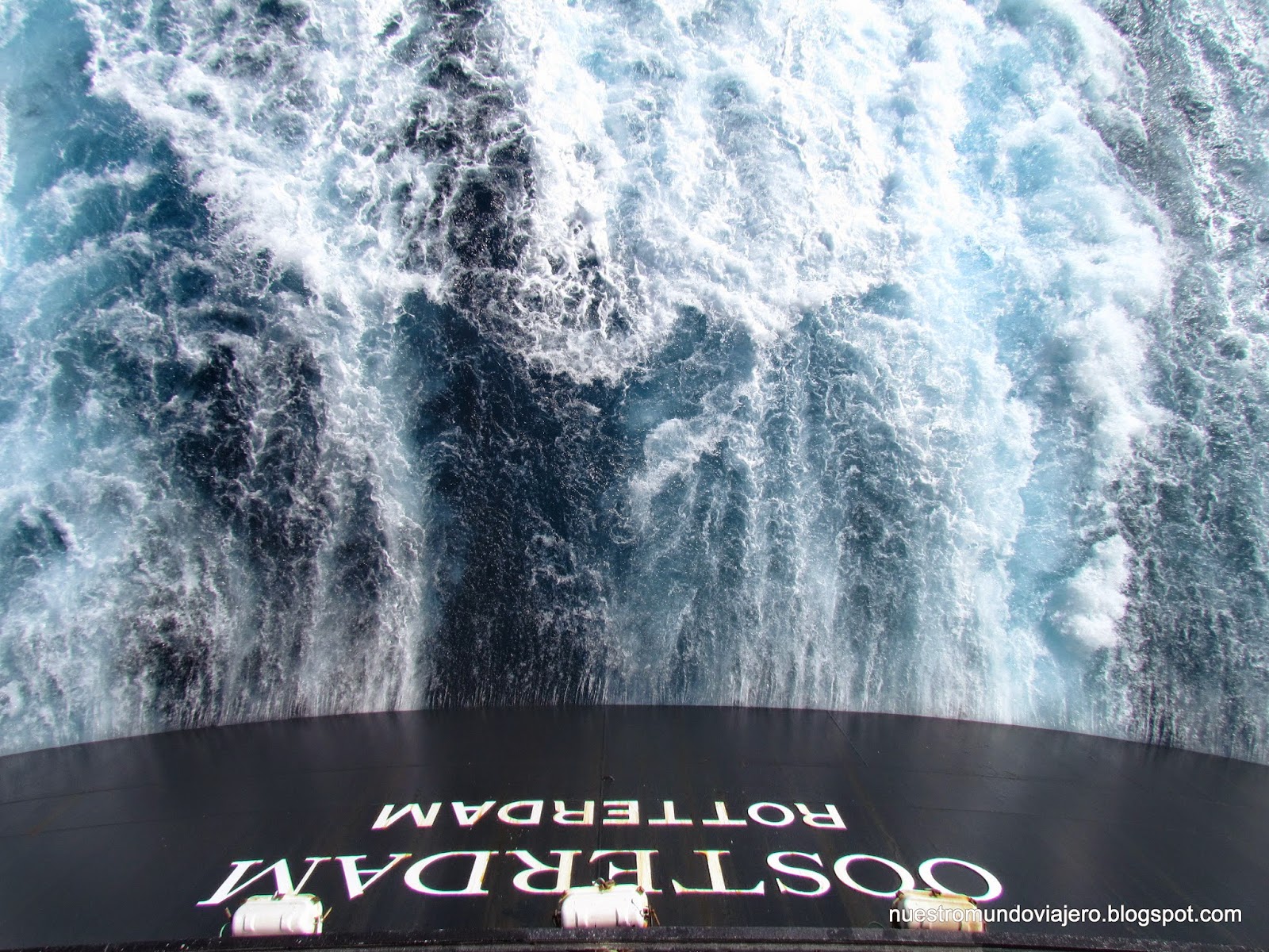 Y comienzo por la estupenda zona de popa del Oosterdam que aúna una gran zona de solárium con mesas con sillas y hamacas donde relajarse, jacuzzis, un bar y una amplia piscina en la que es un auténtico placer bañarse. El lugar ideal para contemplar la estela que deja el Oosterdam en su navegación.