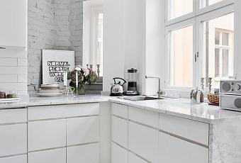 Ya son muchos los ejemplos que os he enseñado en el blog de pequeños pisos muy bien aprovechados, este lo es, pero además está decorado con mucho estilo. Sobre un fondo completamente blanco que refleja la fantástica luz natural que entra a través de los grandes ventanales, sólo alguna pincelada de gris y madera decoran la vivienda. Mobiliario ligero para el salón y el dormitorio con mucho espacio de almacenaje. En la cocina llaman la atención la encimera de mármol blanco y la pared de ladrillo visto pintado de blanco.