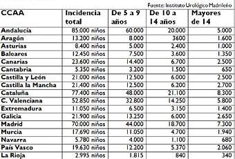 Según datos del Instituto Urológico Madrileño, 70.000 niños madrileños padecen enuresis, de ellos 44.000 tienen entre 5 y 9 años, 18.700 entre 10 y 14 y 7.300 son mayores de 14 años. Este último es probablemente el grupo que más lo sufre por las implicaciones sociales que este trastorno tiene para un adolescente. Baja autoestima, impedimentos para desarrollarse socialmente -acudir a campamentos, colonias ó dormir en casa de amigos-, falta de motivación y fracaso escolar, interrupción del sueño, aislamiento, etc., son algunas de las consecuencias de la enfermedad. De hecho, está considerado por los niños que la sufren entre 8 y 16 años como el acontecimiento más traumático detrás del divorcio y las peleas entre los padres.