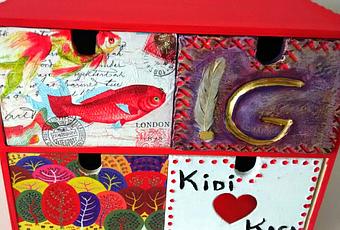 Hoy tengo el gusto de presentaros este mueble joyero color rojo magenta, decorado con papeles, servilleta decoupage y arcilla blanca. Los colores que destacan a parte del rojo son: blanco, verde, moardo y dorado. Creo que el resultado es bastante chulo, me gusta.