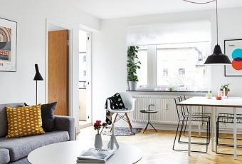 Tenéis un claro ejemplo de esta técnica en este piso sueco de 74 m² en el que a pesar de haber muchas piezas en el salón, el aire fluye entre las estructuras sin dar apariencia de decoración apiñada o recargada: mesas de comedor de tablero delgado y patas finas, sillas con patas de metal, aparador blanco que se funde con la pared, son algunos ejemplos. En el pasillo también podéis apreciar los grandes armarios empotrados apenas perceptibles pero de gran importancia para guardar todo lo que no se usa. ¡Feliz martes!