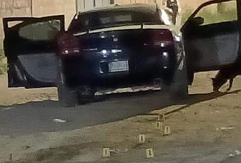 En la calle Emiliano Zapata se localizó un automóvil Dodge Charger que presentaba orificios por disparo de arma de fuego y elementos balísticos en su interior.