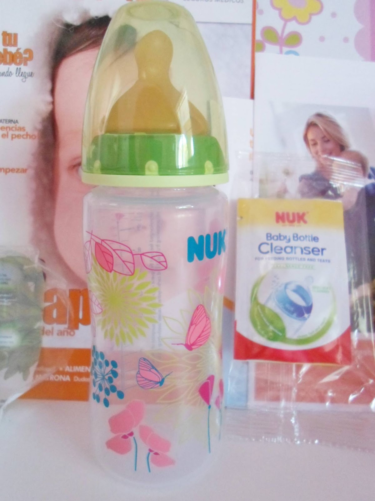 Biberon de Nuk con un diseño monisimo -mariposas rosas y flores- y un paquetito de detergente para biberones de la marca Nuk -la primera vez que lo veo-