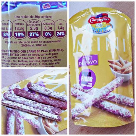En el interior del paquete había cinco barritas de salchichón que estaban riquísimas. El salchichón es algo que me cuesta no comer, si lo tengo en casa. Así que fue todo un acierto. A Mamá Envuelta en Crema, también :-)