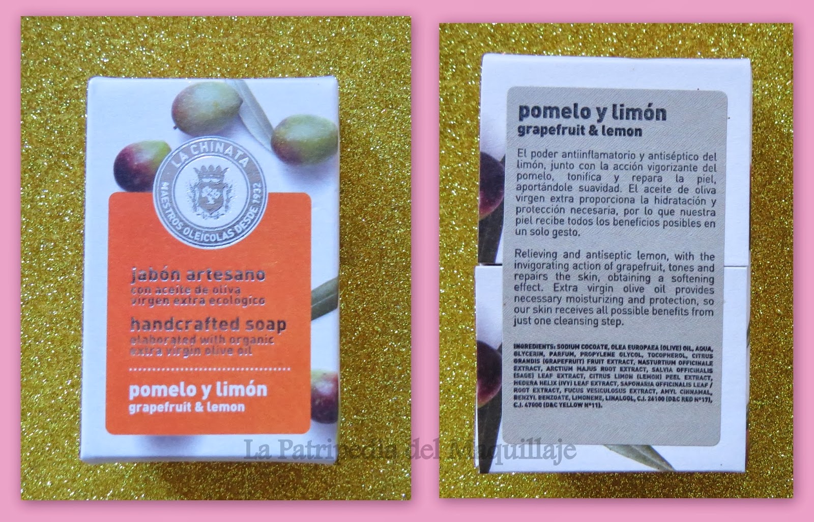 - Jabón artesano tonificante de pomelo y limón de La Chinata: ufff me encanta, es muy natural, tiene un olor agradable; pomelo y limón antinflamatorio y tonificante. También contiene aceite de oliva que hidrata por lo que me parece estupendo para tenerlo en el baño, un jabón muy completo! Además tenía muchísimas ganas de probar la marca así que menuda alegría!