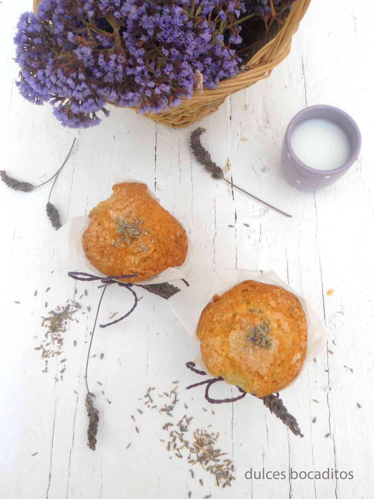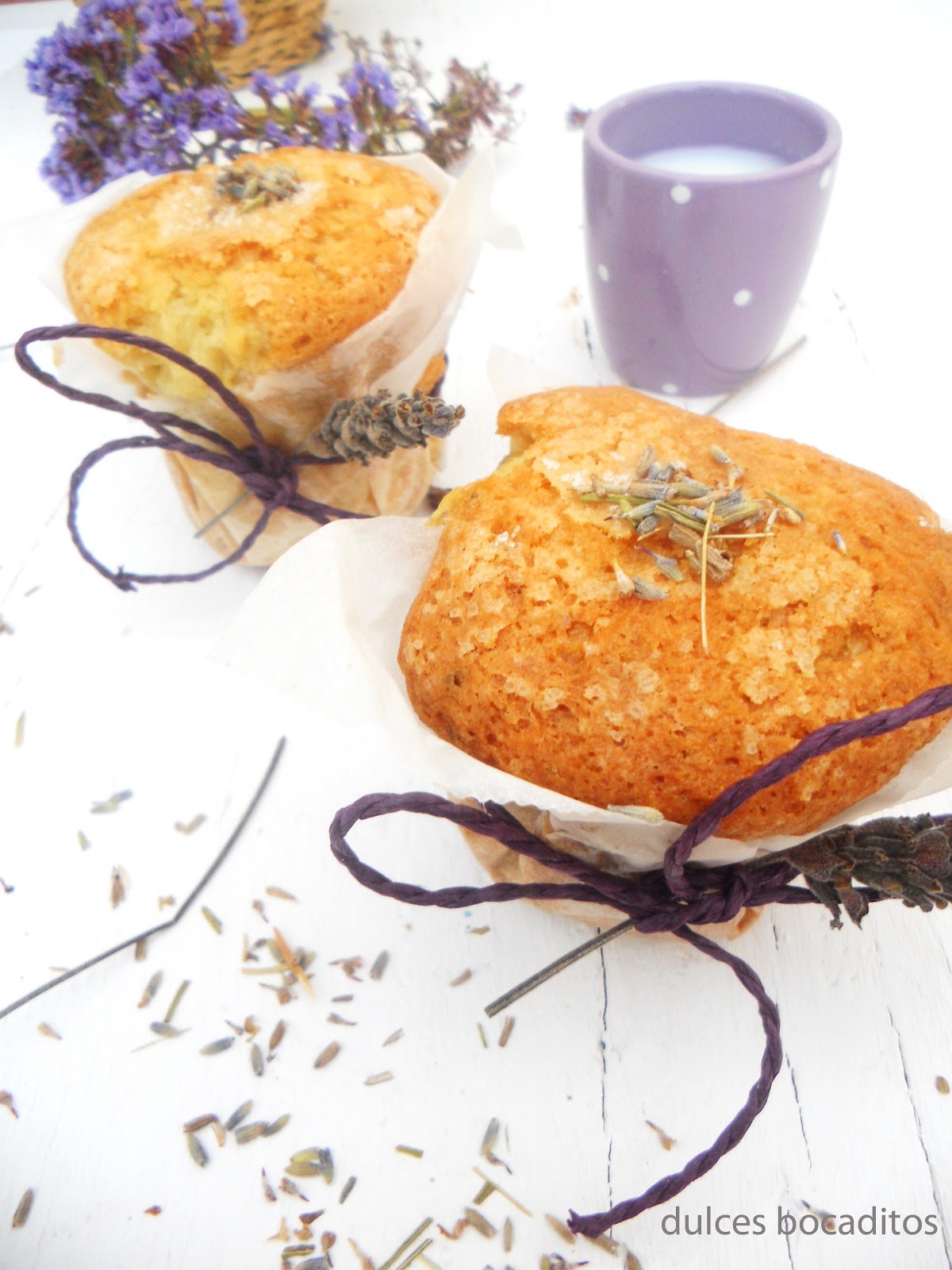 PREPARACIÓN:El procedimiento es muy fácil. Precalentamos el horno a 180º. Colocamos los huevos en un bol con el azúcar y mezclamos con la batidora durante unos minutos hasta que se deshaga el azúcar y los huevos estén espumosos. A continuación añadimos el aceite y la esencia de vainilla y removemos para integrar todo bien. Se vuelca el medio yogur y la leche y se sigue uniendo los ingredientes.Por último tamizamos la harina, los papeles de gaseosa y la lavanda y se añaden a lo anterior. Se mueve y se echa rápidamente en los moldes de muffins para meterlo en el horno enseguida y que no baje el efecto de los papeles de gaseosa. Dejamos hornear durante 20 minutos o hasta que veamos que la muffin está hecha .