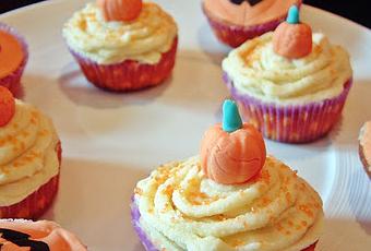 Para el montaje:Quitamos un poco de la masa con la ayuda de un descorazonador de manzanas y rellenamos con ganaché y tapamos1º modelo: Cortamos círculos de fondat naranja del tamaño del muffin y trazamos lineas simulando la calabaza y con rotulador comestible negro dibujamos los ojos, nariz y boca. Cubrimos con una capa de ganaché que nos va a servir de "pegamento" para el fondat naranja de calabaza.