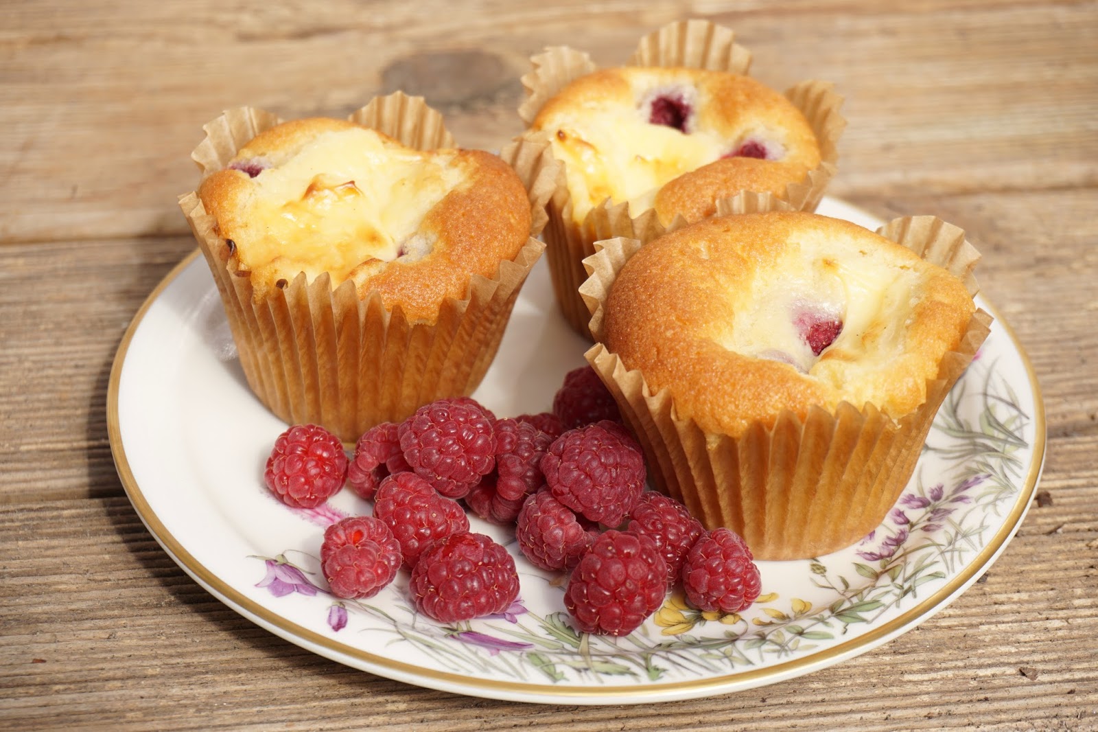 Batimos los huevos y el azúcar a velocidad media/alta hasta conseguir una mezcla clara y que haya duplicado su volumen. Añadimos la leche y el aceite poco a poco y seguimos batiendo. Incorporamos la harina, la levadura y la sal tamizadas batiendo despacio, el tiempo justo para que la mezcla sea homogéna. Reservamos. En un bol aparte, mezclamos el yema de huevo, el azúcar, el queso crema y la vainilla hasta conseguir una crema lisa. Montaremos los muffins echando una buena cucharada de masa en el molde (hasta la mitad), 3 o 4 frambuesas y encima una cucharada de la crema cheesecake. Horneamos durante 20-25 minutos o hasta que al pinchar la masa con un palillo salga limpio (Importante pinchar la parte de la masa, no el cheesecake porque es cremoso y siempre saldría manchado).