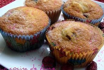 - Para 9 unidades: Precalentar el horno a 180º. Poner a hidratar en zumo de naranja 50 grs. de arándanos rojos deshidratados. Mezclar en un bol 80 grs. de mantequilla reblandecida y 100 grs. de azúcar glas. Batir bien y añadir 1 huevo grande y 2 cuch. de leche, mezclando todo bien. Añadir 100 grs. de harina bizcochona (harina con levadura) y mezclar bien. Escurrir los arándanos y añadir a la masa, mezclando suavemente. Repartir la masa entre los moldes de papel, puestos en una bandeja para muffins. Hornear unos 15´ hasta que hayan subido y estén dorados. Dejar enfriar sobre una rejilla metálica.