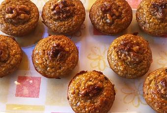 Llevar la masa a los moldes sin llenarlos del todo y cubrir si se quiere con un poco de semillas de chía, o de sésamo, nueces o trocitos de chocolate para darle un toque diferente. Hornear unos 20-22 minutos hasta que al pinchar con un palillo salga limpio.