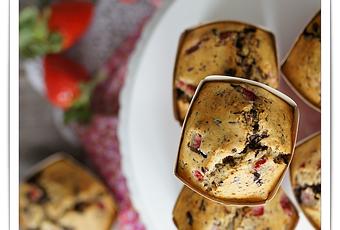 Precalentaremos el horno a 190º. Trocearemos el chocolate de manera tosca y que nos queden trozos irregulares. Lavaremos las fresas y las partiremos en trozos pequeños. En un cuenco mezclaremos los huevos, la nata, la ralladura de limón, el azúcar y la mantequilla, y mezclaremos hasta integrarlos todos los ingredientes bien. Agregaremos los ingredientes secos la harina y la levadura (ambos tamizados), mezclaremos suavemente hasta que se integren. Finalmente incorporaremos los trozos de chocolate y de fresa (reservaremos unos pocos para la decoración final) y lo removemos bien. Verteremos la mezcla en los moldes de papel llenándolos las 3/4 partes. Terminaremos repartiendo más trozos de fresas por encima de cada muffin. Horneamos durante 25-30 minutos o hasta que al pinchar con un palito de brocheta éste salga limpio. Una vez hechos, sacaremos del horno y dejaremos enfriar por completo sobre una rejilla.