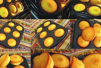 Precalentar el horno a 175ºC. Batir los huevos, el azúcar y la mantequilla hasta que la mezcla esté esponjosa, agregar el jugo de naranja con la ralladura, mezclar la harina, la levadura en polvo y la sal y añadirlo a la mezcla. Batir bien y vaciar en moldes para muffins previamente enmantequillados. Hornear a 175ºC durante 30 minutos o hasta que estén dorados.